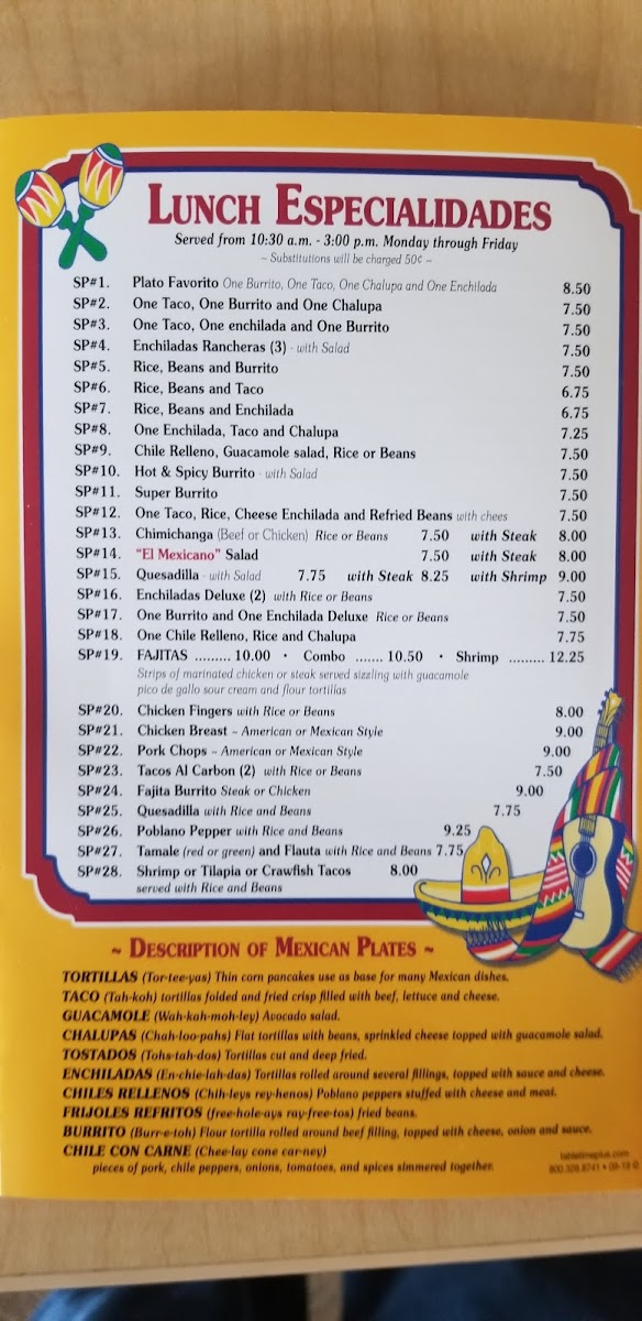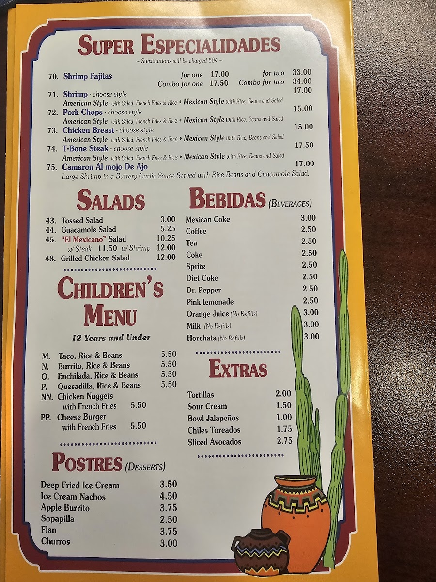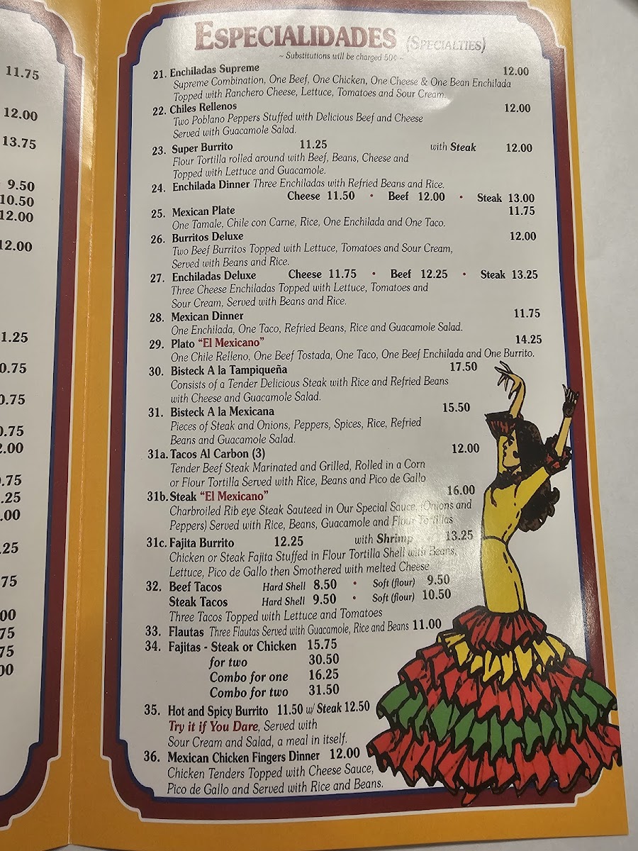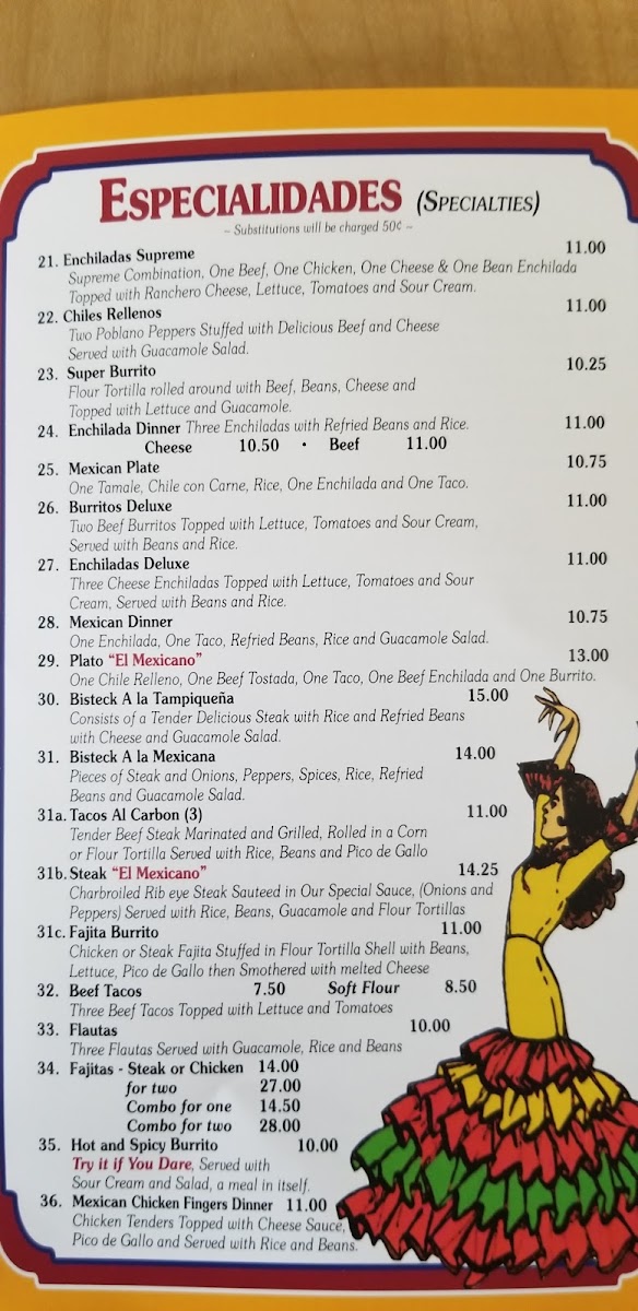 Dining at El Mexicano on W Airline Hwy is a flavorful journey through classic Mexican cuisine, offering a menu that caters to every craving. The Especialidades section shines with options like Enchiladas Supreme, Chiles Rellenos, and the hearty Super Burrito, while the Enchilada Dinner and Mexican Plate promise satisfying portions complete with tortillas, tacos, and guacamole. Lunch diners can enjoy the Plato Favorito, or mix and match favorites such as One Taco, One Burrito And One Chalupa or One Taco, One Enchilada And One Burrito, along with the spicy kick of the Hot & Spicy Burrito. For lighter bites, the Botanas-including Bean Dip, Nachos With Beans, Nachos With Beef Or Chicken, and Combo Nachos With Beans-offer shareable indulgence. The A La Carte options, from Refried Beans to Chile Con Carne Bowl, Chile Relleno, and Tamale, let patrons customize their meal, while vegetarian diners are well served with Vegetarian Quesadilla, Vegetarian Plate, and Enchiladas Rancheras Deluxe Plate. The menu also highlights signature dishes like Chicken Enchiladas, Enchiladas Verdes, Chimichanga, Chicken & Cheese Quesadillas, and Chicken Tacos, each reflecting the rich, authentic flavors that make El Mexicano a local favorite. With its wide array of choices, the restaurant balances traditional favorites and creative combinations, ensuring there’s something for everyone-from hearty burritos and enchiladas to light vegetarian plates and shareable snacks. Every dish is presented with care, making it easy to savor the variety without feeling overwhelmed. Overall, the menu is a testament to classic Mexican comfort food, thoughtfully organized and priced to appeal to both regulars and first-time visitors alike.