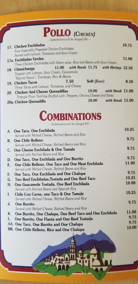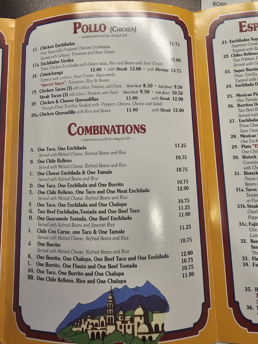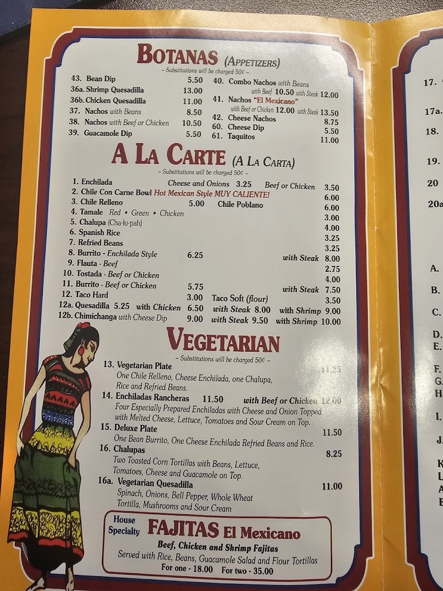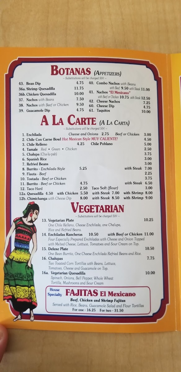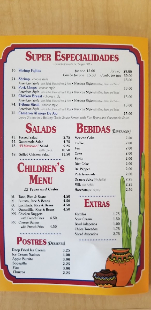Dining at El Mexicano on W Airline Hwy is a flavorful journey through classic Mexican cuisine, offering a menu that caters to every craving. The Especialidades section shines with options like Enchiladas Supreme, Chiles Rellenos, and the hearty Super Burrito, while the Enchilada Dinner and Mexican Plate promise satisfying portions complete with tortillas, tacos, and guacamole. Lunch diners can enjoy the Plato Favorito, or mix and match favorites such as One Taco, One Burrito And One Chalupa or One Taco, One Enchilada And One Burrito, along with the spicy kick of the Hot & Spicy Burrito. For lighter bites, the Botanas-including Bean Dip, Nachos With Beans, Nachos With Beef Or Chicken, and Combo Nachos With Beans-offer shareable indulgence. The A La Carte options, from Refried Beans to Chile Con Carne Bowl, Chile Relleno, and Tamale, let patrons customize their meal, while vegetarian diners are well served with Vegetarian Quesadilla, Vegetarian Plate, and Enchiladas Rancheras Deluxe Plate. The menu also highlights signature dishes like Chicken Enchiladas, Enchiladas Verdes, Chimichanga, Chicken & Cheese Quesadillas, and Chicken Tacos, each reflecting the rich, authentic flavors that make El Mexicano a local favorite. With its wide array of choices, the restaurant balances traditional favorites and creative combinations, ensuring there’s something for everyone-from hearty burritos and enchiladas to light vegetarian plates and shareable snacks. Every dish is presented with care, making it easy to savor the variety without feeling overwhelmed. Overall, the menu is a testament to classic Mexican comfort food, thoughtfully organized and priced to appeal to both regulars and first-time visitors alike.